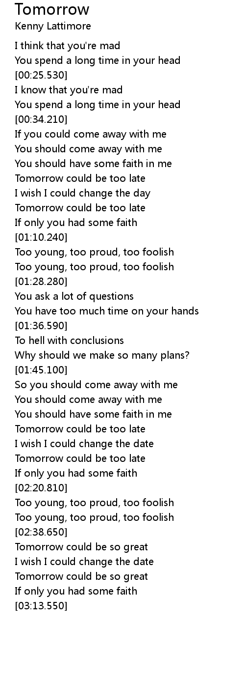 | [02:12.100] | Tomorrow could be too late |