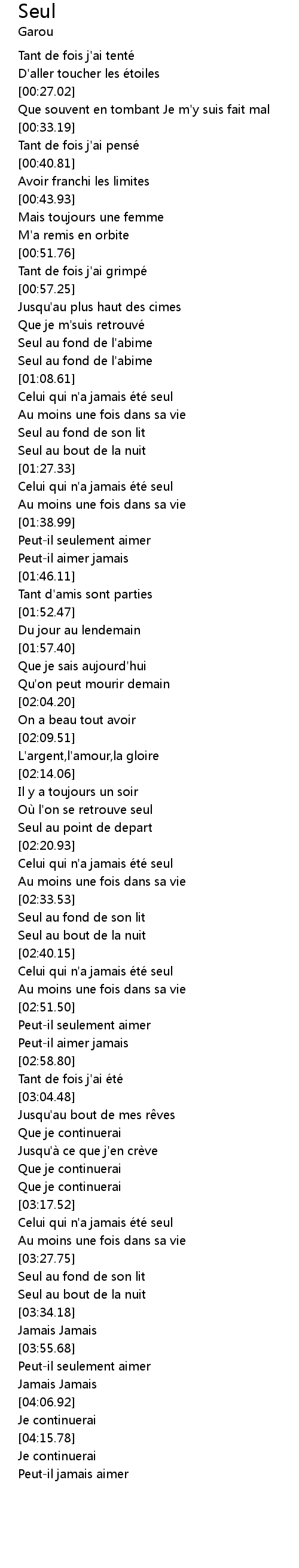 | [02:42.77] | Celui qui n' a jamais é té seul |