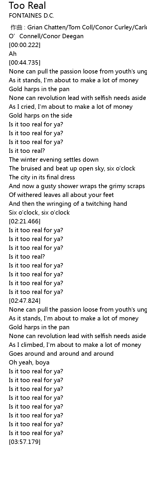 | [02:30.504] | Is it too real for ya? |
