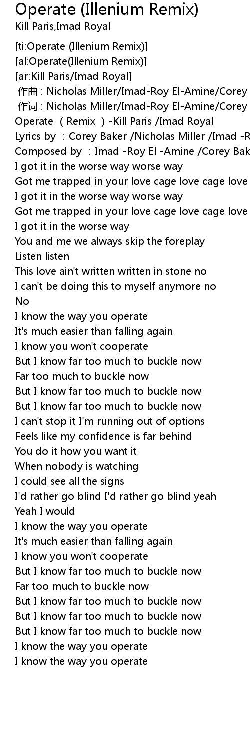 | [00:00.00] | Operate (Remix )-Kill Paris /Imad Royal |