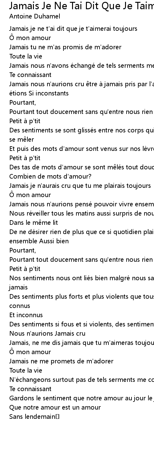 | [00:23.13] | Jamais nous n' aurions cru tre à jamais pris par l' amour nous qui é tions Si inconstants |