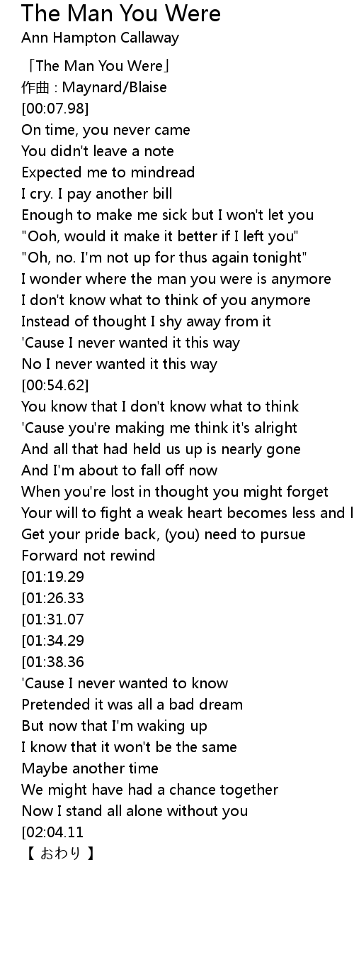 | [02:25.81][01:19.29] | I wonder where the man you were is anymore |