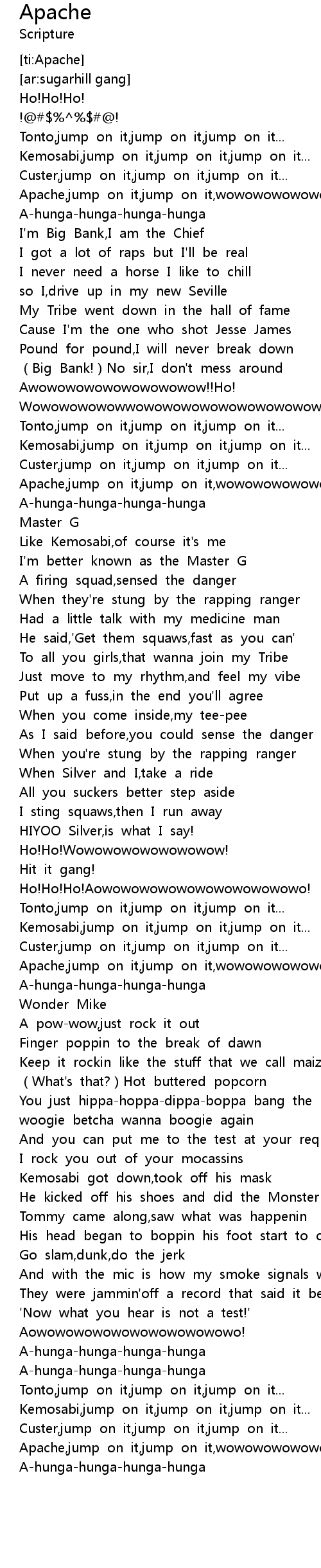 | [02:00.99] | Apache,jump on it,jump on it,wowowowowowowowowo!! |