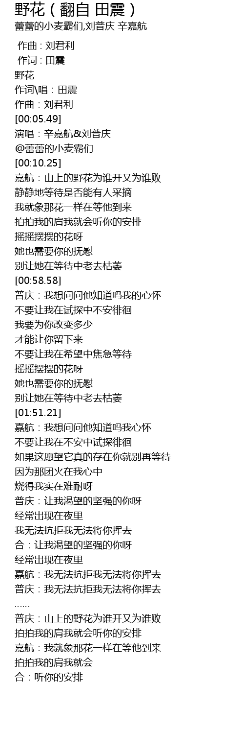 | [00:15.00] | 嘉航:山上的野花为谁开又为谁败 |
