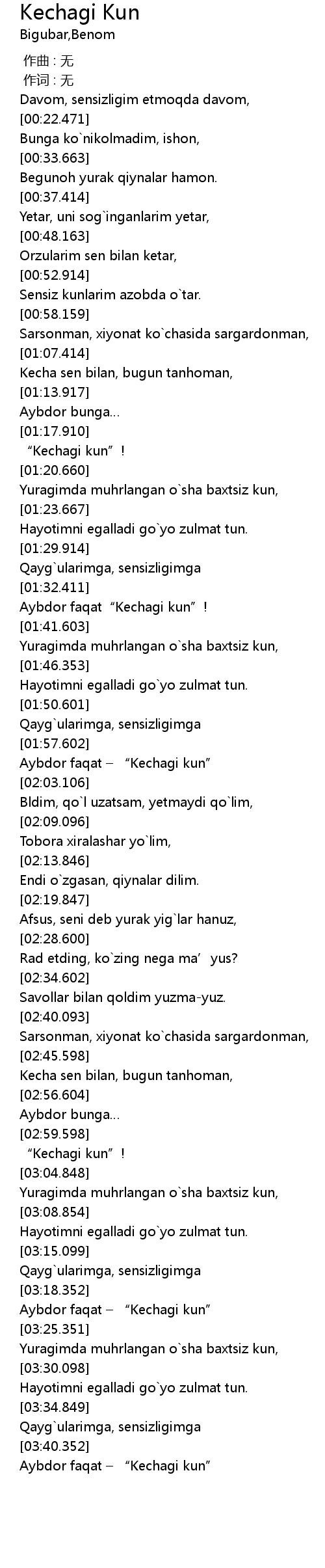 | [03:22.344] | Aybdor faqat " Kechagi kun" |