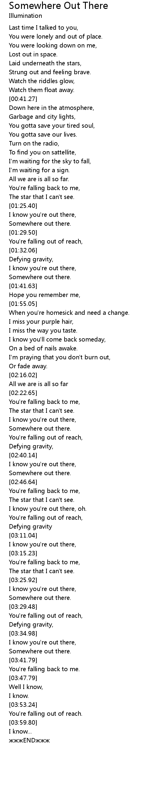 | [02:33.96] | Somewhere out there. |