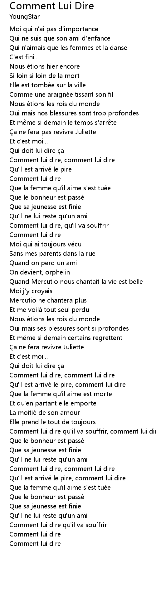 | Song | Comment Lui Dire |