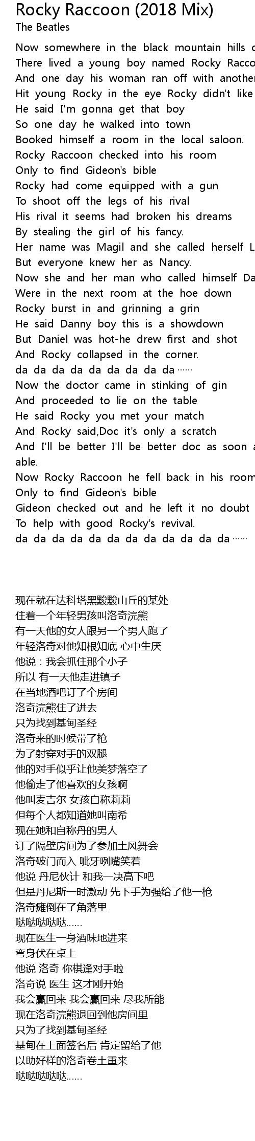 | [02:41.840] | Now Rocky Raccoon he fell back in his room |