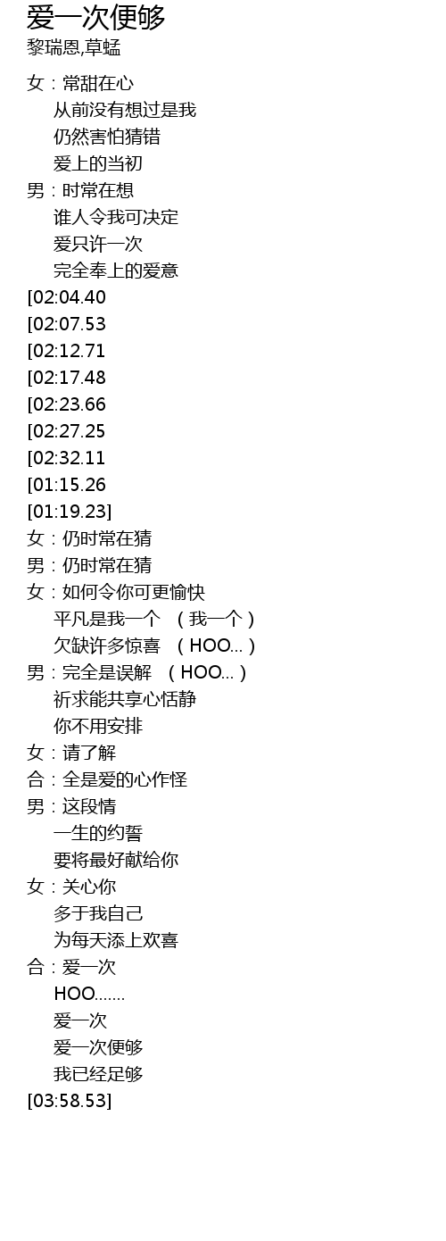 | [02:38.19][01:15.26] | 爱一次便够 |