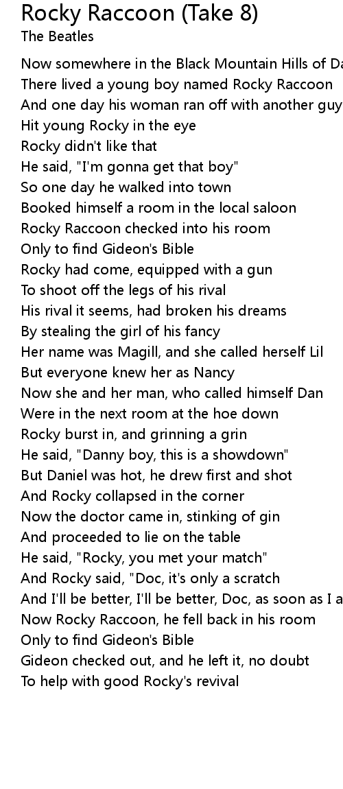 Now Rocky Raccoon, he fell back in his room |