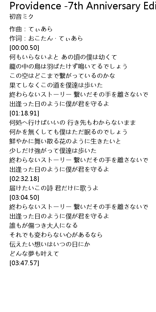 | [03:12.29] | 終わらないストーリー 繋いだその手を離さないで |