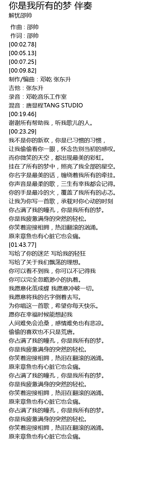 | [03:03.77] | 你占满了我的瞳孔,你是我所有的梦。 |