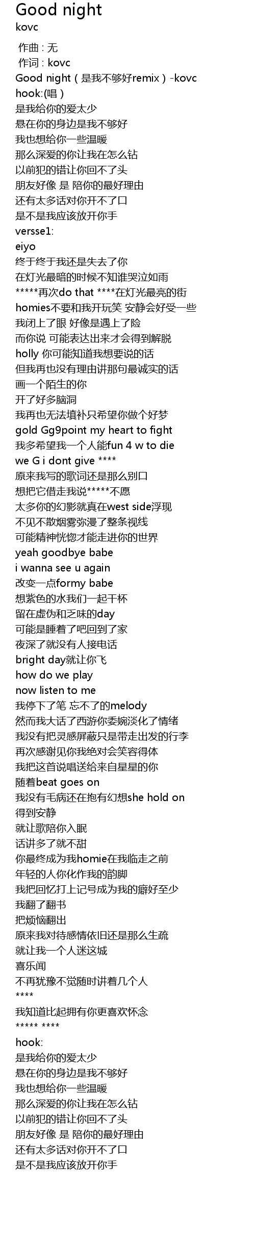 | [00:17.13] | Good night shì wǒ bù gòu hǎo remix kovc |