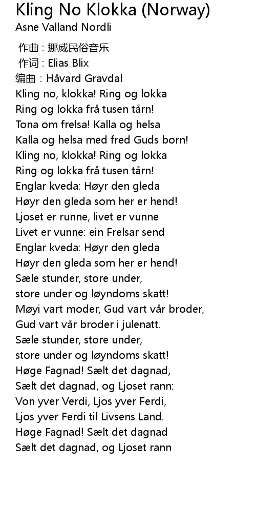 | [00:34.05] | Kling no, klokka! Ring og lokka |