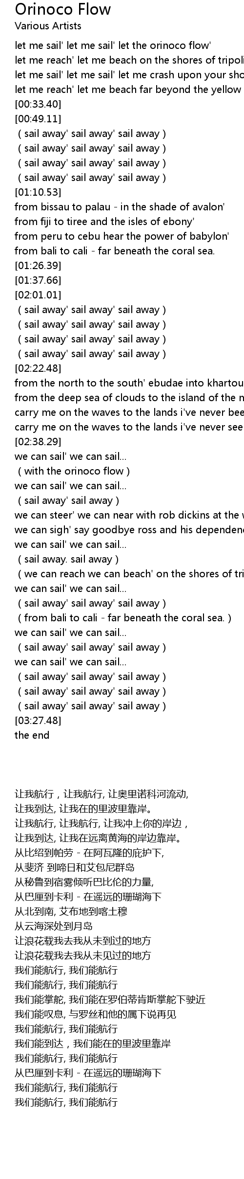 | [00:16.72] | let me sail' let me sail' let the orinoco flow' |