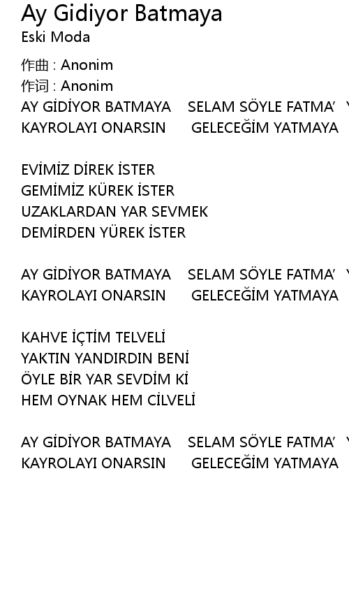 | AY GİDİYOR BATMAYA SELAM SÖYLE FATMA’YA | |