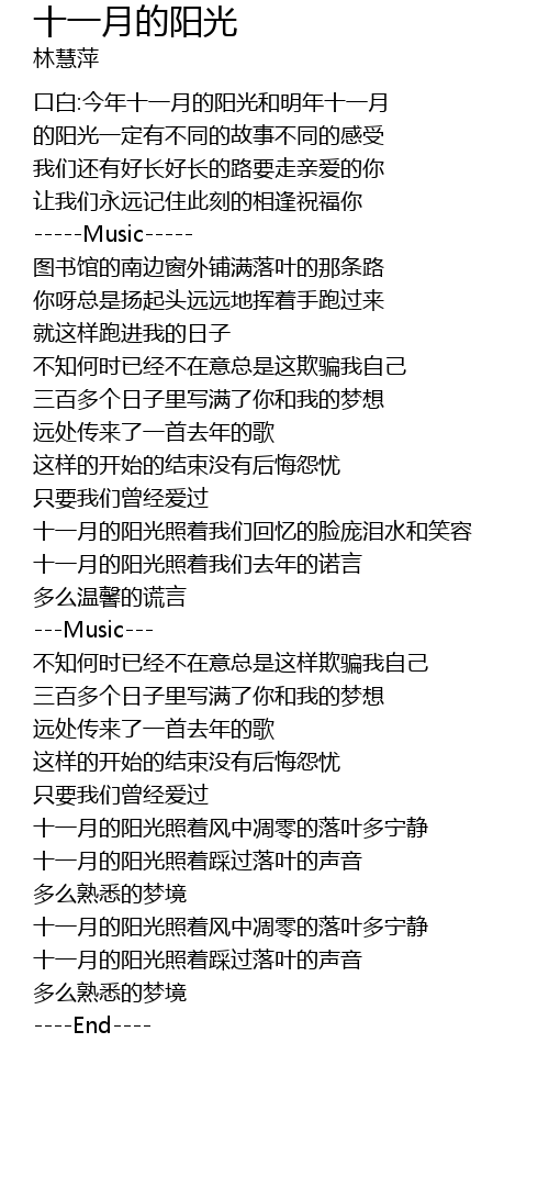 | [03:59.31] | 十一月的阳光照着踩过落叶的声音 |