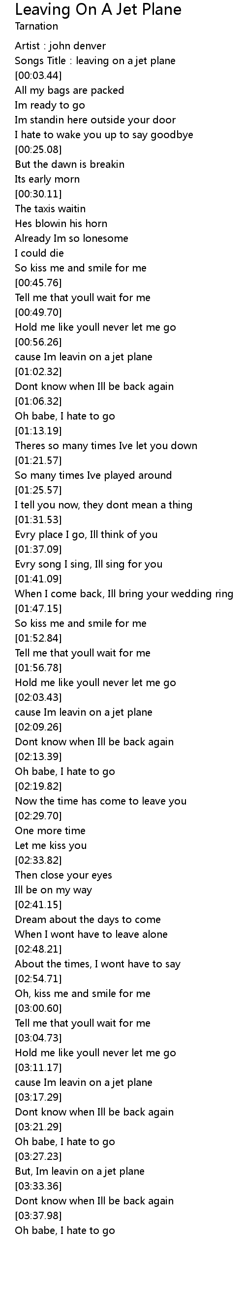 | [00:01.50] | Songs Title: leaving on a jet plane |