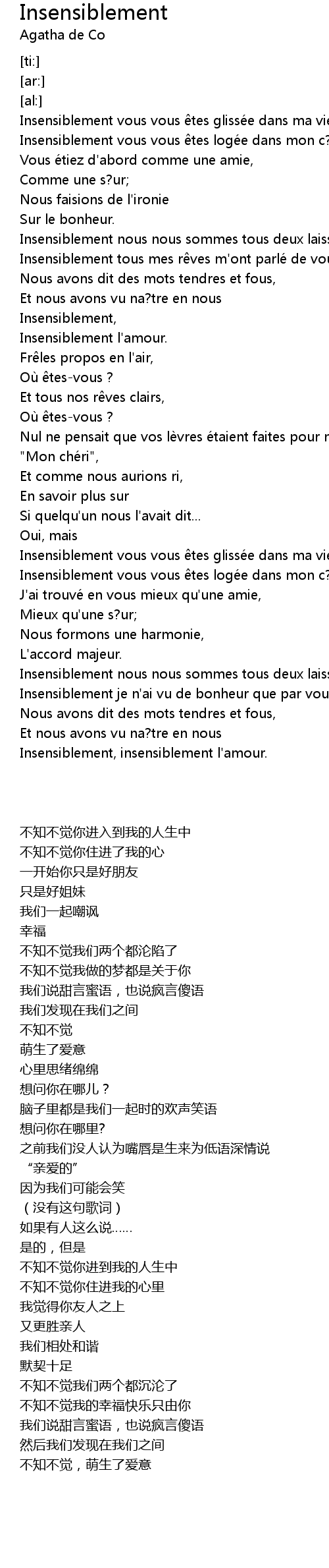 | [00:13.53] | Insensiblement vous vous êtes glissée dans ma vie, |