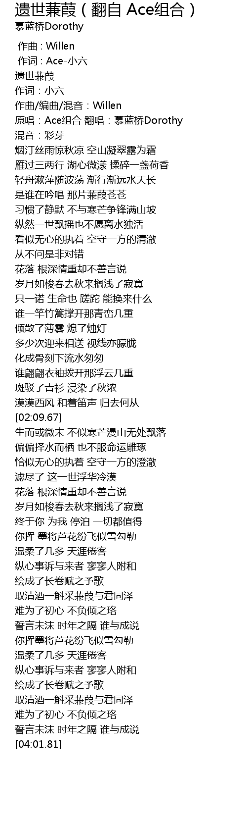| [00:18.84] | 原唱:Ace组合 翻唱:慕蓝桥Dorothy |