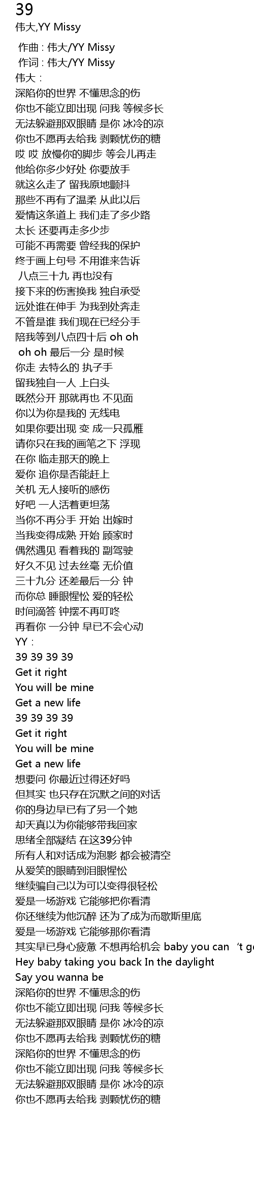 | [00:01.000] | 作词 : 伟大/YY Missy |
