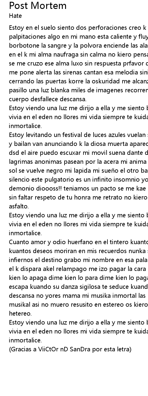 | Cuanto amor y odio huerfano en el tintero kuantos tk prohibieron mis silencios kuantos deseos moriran en mis recuerdos nunka sere padre el peor de los infiernos el destino grabo mi nombre en esa pala lucifer las cargas pero no es el k dispara akel relampago me izo pagar la cara kuando un kañon scupe fuego kien lo apaga dime kien lo para dime kien lo paga kuando lauicedad ma yega kien escapa kuando su danza sigilosa te seduce kuando las luces negras te iluminen descansa no yores mama mi musika inmortal las balas no atraviesan una nota musikal asi no muero resusito en estereo os kiero! siempre existirá mi rap hetereo. | |