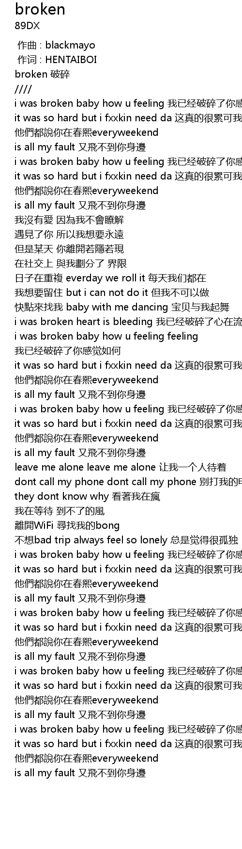 | [00:36.878] | i was broken baby how u feeling 我已经破碎了你感觉如何 |