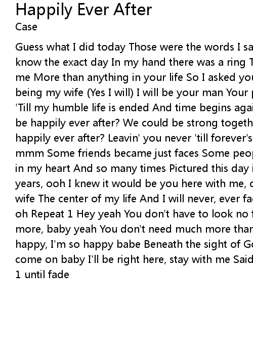 Guess what I did today Those were the words I said to you It was last May, don't know the exact day In my hand there was a ring Then you told me that you loved me More than anything in your life So I asked you would you do me The honor of being my wife (Yes I will) I will be your man Your protector, your best friend 'Till my humble life is ended And time begins again, couldn't we 1 - Couldn't we be happily ever after? We could be strong together for so long Couldn't we be happily ever after? Leavin' you never 'till forever's gone When I was away, mmm, mmm Some friends became just faces Some people grew apart But you stayed right in my heart And so many times Pictured this day inside my mind And for so many years, ooh I knew it would be you here with me, oh (Yes I will) Take you for my wife The center of my life And I will never, ever fade From this choice I made, oh Repeat 1 Hey yeah You don't have to look no further than me Don't look no more, baby yeah You don't need much more than my lovin' to make you happy I'm so happy, I'm so happy babe Beneath the sight of God I will make this vow to you So come on baby I'll be right here, stay with me Said I'll be here baby, hey Repeat 1 until fade |