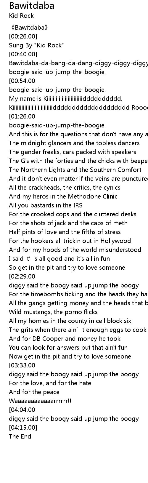 | [04:10.00][04:04.00][03:59.00][03:54.00] | Bawitdaba da bang a dang diggy diggy diggy said the boogy said up jump the boogy |