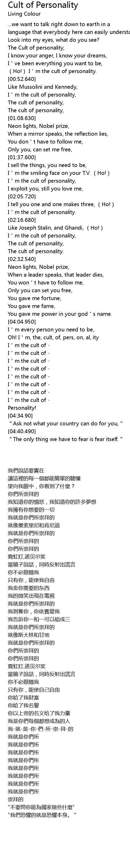 | [00:47.650] | (Ho!) I'm the cult of personality. |