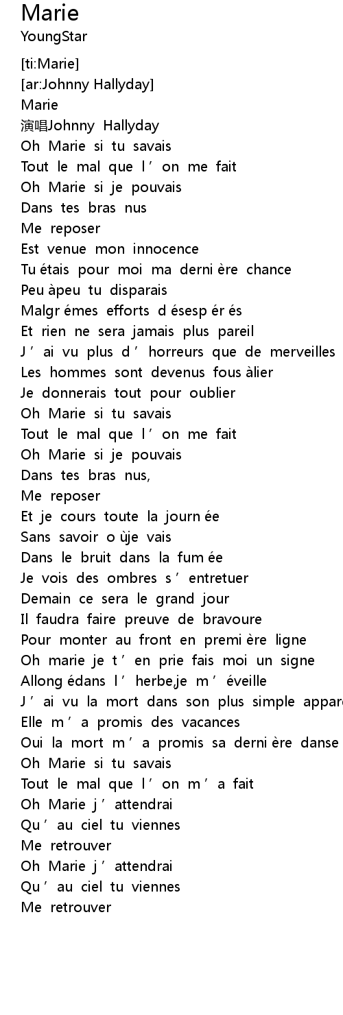 | [02:20.351] | Oh marie je t ' en prie fais moi un signe |