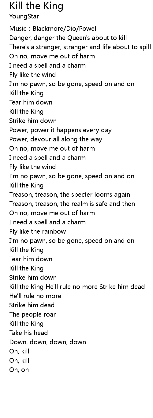 | Kill the King He'll rule no more Strike him dead | |