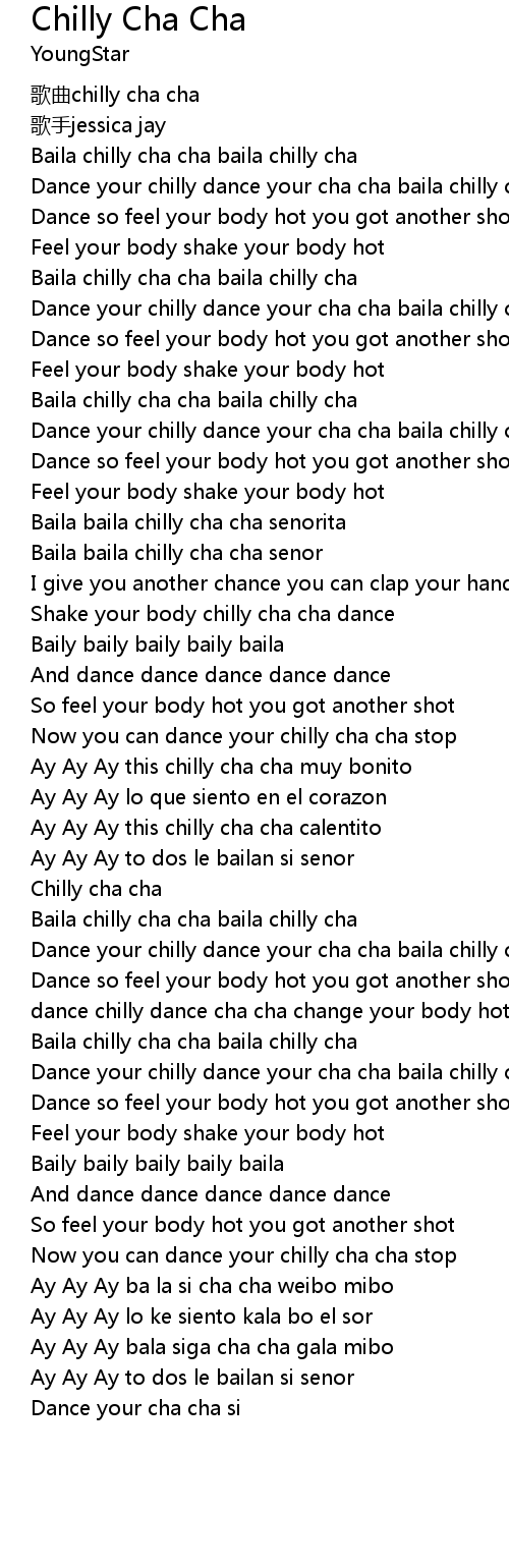 | [00:32.39] | Dance your chilly dance your cha cha baila chilly cha cha |