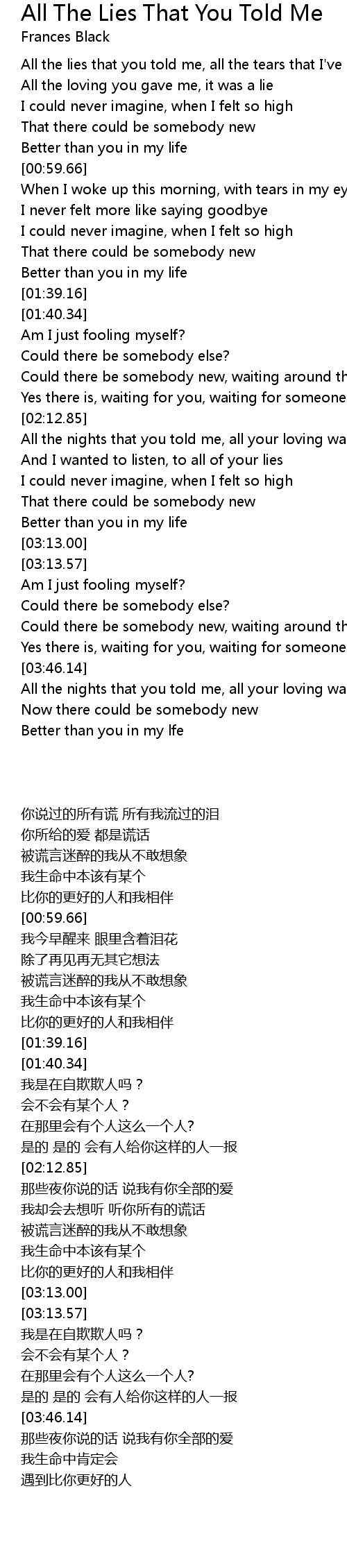 [00:18.79] All the lies that you told me, all the tears that I've cried