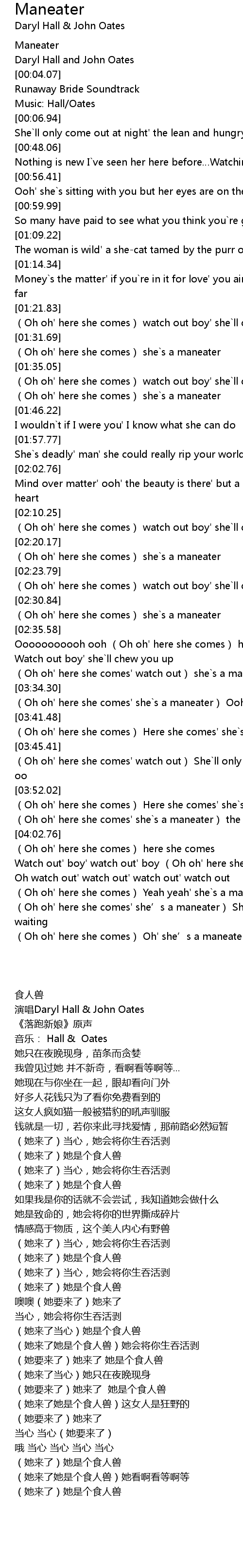 | [04:16.67] | (Oh oh' here she comes' she’s a maneater) She’s watching and waiting |
