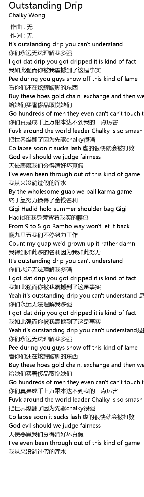| [00:05.749] | It' s outstanding drip you can' t understand nǐ men yǒng yuǎn wú fǎ lǐ jiě wǒ duō qiáng |