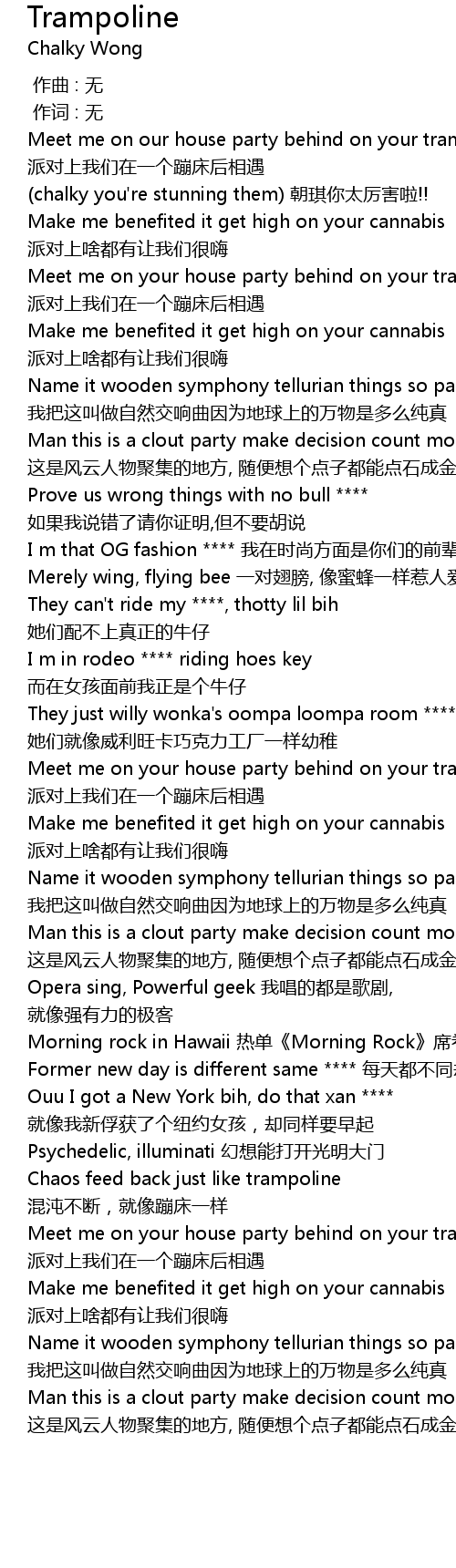 | [00:05.510] | Meet me on our house party behind on your trampoline pai dui shang wo men zai yi ge beng chuang hou xiang yu |