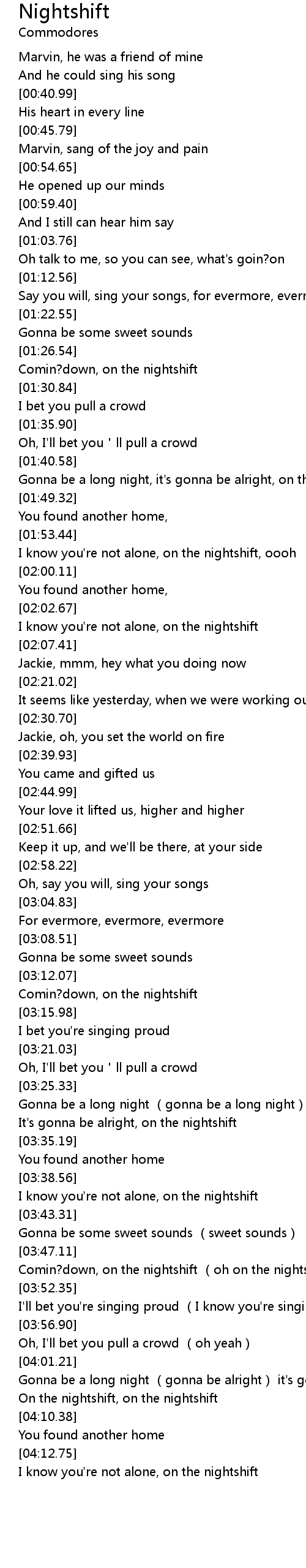| [01:42.89] | Gonna be a long night, it's gonna be alright, on the nightshift |