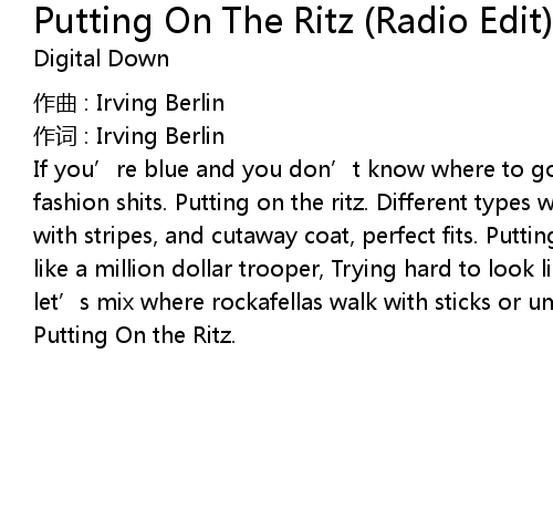 | If you' re blue and you don' t know where to go to, Why don' t you go where fashion shits. Putting on the ritz. Different types who wearaday coat pants, with stripes, and cutaway coat, perfect fits. Putting On the ritz. Dressed up like a million dollar trooper, Trying hard to look like Gary Cooper. Come let' s mix where rockafellas walk with sticks or umbarellas in their mits. Putting On the Ritz. |