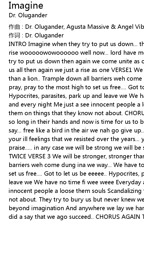 | INTRO Imagine when they try to put us down... then Jah Jah say that we should rise wooooowowoooooo well now... lord have mercy CHORUS TWICE Imagine when they try to put us down then again we come unite as one Imagine when they try to kill us all then again we just a rise as one VERSE1 We will be stronger, stronger than a lion.. Trample down all barriers weh come dung ina we way... We have to pray, pray to the most high to set us free.... Got to let us be eeeee.. Hypocrites, parasites, park up and leave we We have no time fi wee weee Everyday and every night Me just a see innocent people a loose their souls Scandalizing them on things that they know not about. CHORUS AGAIN TWICE VERSE 2 We suffered so long in their hands and now is time for us to be free freedom is a must I say... free like a bird in the air we nah go give up.. even you plot against us your ill feelings that we resisted over the years... you no deserve any praise..... in any case we will be strong we will be strong........ CHORUS AGAIN TWICE VERSE 3 We will be stronger, stronger than a lion.. Trample down all barriers weh come dung ina we way... We have to pray, pray to the most high to set us free.... Got to let us be eeeee.. Hypocrites, parasites, park up and leave we We have no time fi wee weee Everyday and every night Me just a see innocent people a loose them souls Scandalizing them on things that they know not about. They try to bury us but never knew we were seeds Growing so wild beyond imagination And anywhere we lay we hands we have to proceed Ca Jah jah did a say that we ago succeed.. CHORUS AGAIN TO FADE |