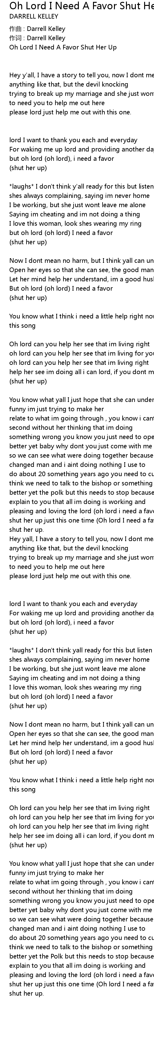 | pleasing and loving the lord oh lord i need a favor I need a big favor lord, shut her up just this one time Oh lord I need a favor | |