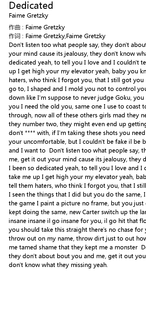 | Don' t listen too what people say, they don' t about bout you and me, get it out your mind cause its jealousy, they don' t know what they missing. I been so dedicated yeah, to tell you I love and I couldn' t tell you later yeah, take me up I get high your my elevator yeah, baby you know the one and you can tell them haters, who think I forgot you, that I still got you need I want you, you are my go to, I shaped and I mold you not to control you, you like my pro tools lay it down like I' m suppose to never judge Goku, you keep saying I don' t know, I knew you I need the old you, same one I use to coast to all of the problems I go through, now all of these others girls mad they never switch up your position they number two, they might even end up getting my to, but that doesn' t mean I don' t with, if I' m taking these shots you need cover to, I know you think your uncomfortable, but I couldn' t be fake il be blunt you, I' m in love with you and I want to Don' t listen too what people say, they don' t about bout you and me, get it out your mind cause its jealousy, they don' t know what they missing. I been so dedicated yeah, to tell you I love and I couldn' t tell you later yeah, take me up I get high your my elevator yeah, baby you know the one and you can tell them haters, who think I forgot you, that I still got you I seen the pain, I seen the things that I did but you do the same, I seen the change switch up the game I paint a picture no frame, but you just call that shit a stain, I just kept doing the same, new Carter switch up the lane and I know that' s so insane, insane insane il go insane for you, il go hit that floor and il chase for you, you should take this straight there' s no chase for you, get out of brain bitches throw out on my name, throw dirt just to out how I flame, mad because you kept me tamed shame that they kept me a monster Don' t listen too what people say, they don' t about bout you and me, get it out your mind cause its jealousy, they don' t know what they missing yeah. |