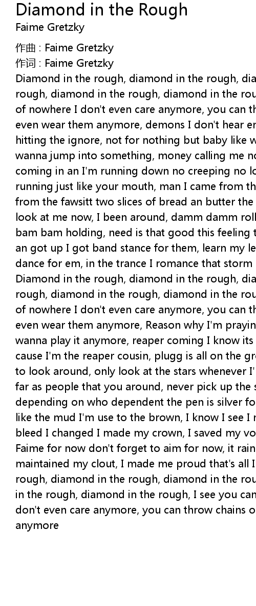 | Diamond in the rough, diamond in the rough, diamond in the rough, diamond in the rough, diamond in the rough, diamond in the rough, I see you can cause pain out of nowhere I don't even care anymore, you can throw chains out nowhere I don't even wear them anymore, demons I don't hear em anymore, ex calling now I'm hitting the ignore, not for nothing but baby like who rushing I pull up when I wanna jump into something, money calling me now some people who owe me money coming in an I'm running down no creeping no look around, funny yo it go blouw, running just like your mouth, man I came from the gutter, the water straight from the fawsitt two slices of bread an butter the only thing in my house yeah, look at me now, I been around, damm damm rolling, smoking the backwood look what bam bam holding, need is that good this feeling transpire for them, took my hit an got up I got band stance for them, learn my lesson my diamonds always dance dance for em, in the trance I romance that storm cause imma | |