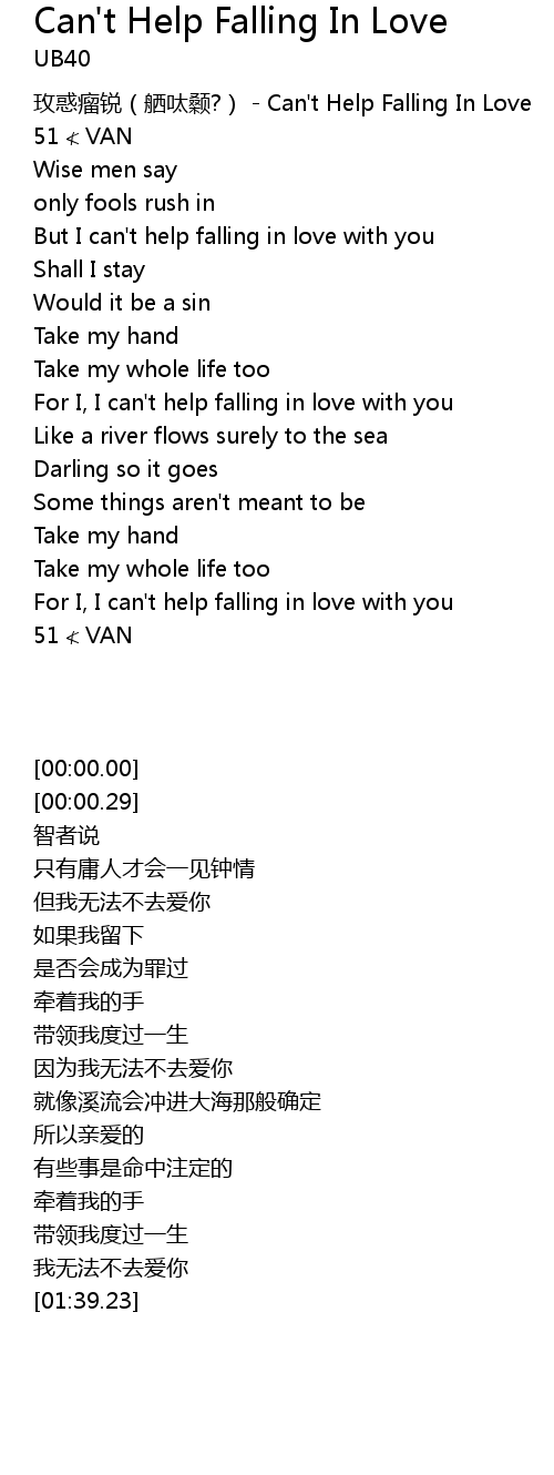 | [01:23.51] | For I, I can' t help falling in love with you |
