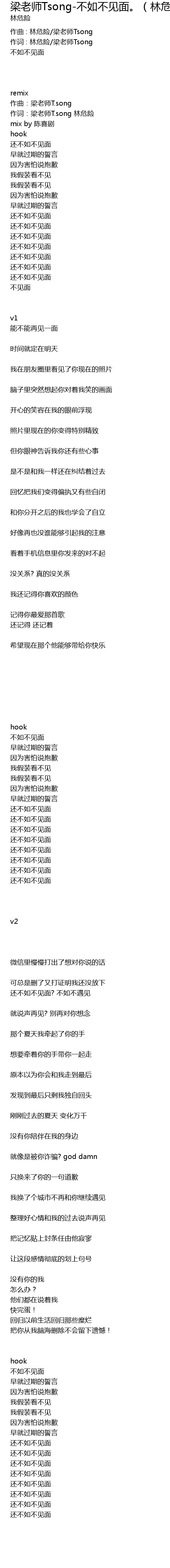 | Song | 梁老师Tsong-不如不见面。(林危险 remix) |