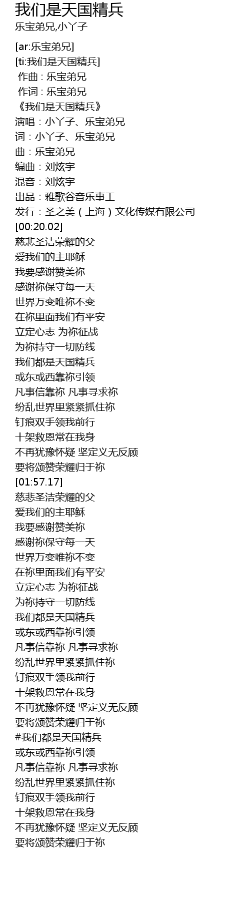 | [00:04.20] | 词:小丫子、乐宝弟兄 |