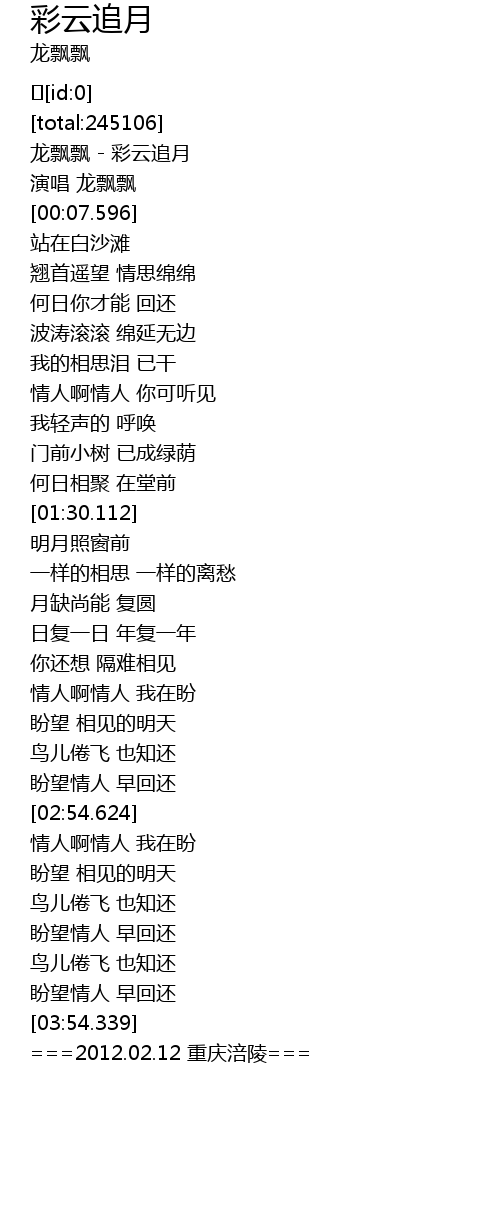 | [00:00.487] | 龙飘飘 - 彩云追月 |