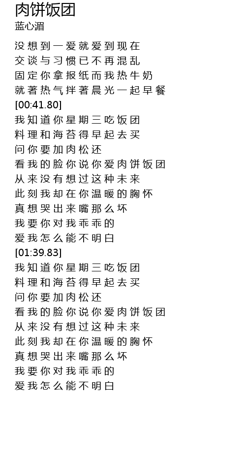 | [01:11.31] | kàn wǒ de liǎn nǐ shuō nǐ ài ròu bǐng fàn tuán |