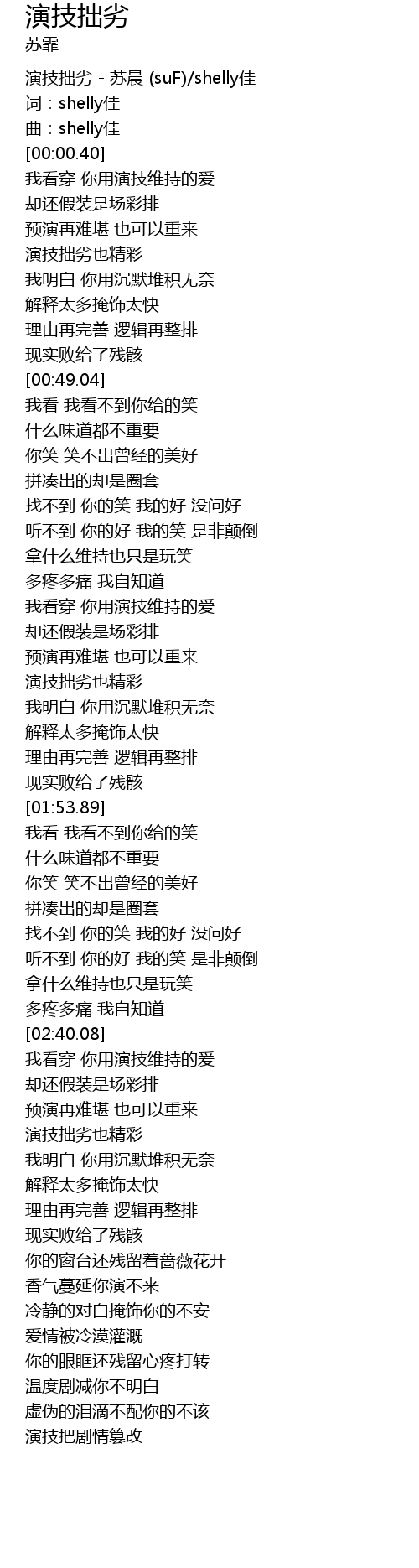 | [00:00.10] | 演技拙劣 - 苏晨 (suF)/shelly佳 |