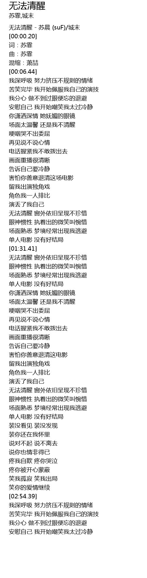 | [00:00.10] | 无法清醒 - 苏晨 (suF)/城末 |